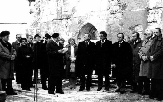 Im Beisein von zahlreicher Prominenz gab Valentin Fürstenhöfer (mitte), als großer Streiter für den Burgaufbau am 15.11.1985 das Zeichen zum Beginn der Aufbauarbeiten.