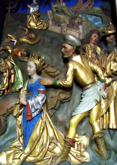 Der "Katharinenaltar" wurde in der Zeit von 1505-10 erschaffen. Der Mittelschrein zeigt eindrucksvoll die Enthauptungsszene der hl. Katharina. Im Hintergrund die vom Blitz erschlagenen Henkersknechte, ein unbekanntes Schloss und das Rad ihrer Marter.