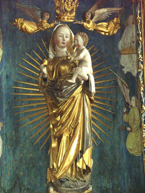 Der Marienaltar zeigt die Gottesmutter im Strahlenkranz der Sonne, umgeben von musizierenden Engeln, der Granatapfel in ihrer Hand steht für die Schönheit und Tugend. Das Jesuskind hat die rechte Hand segnend erhoben, der Reichsapfel ist das zeichen seiner Vollmacht.