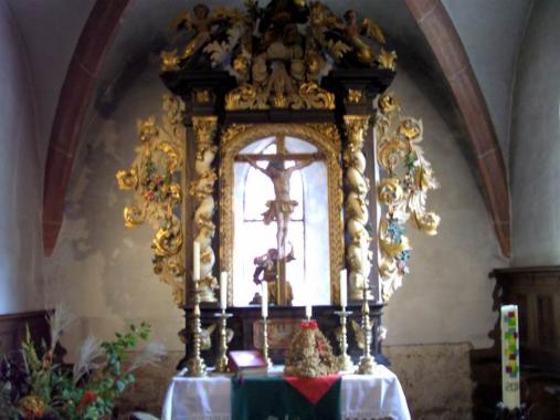 Der Hauptaltar im Chorraum wurde 1725 in Wilhermsdorf geschaffen. Am Fuß des Kreuzes kniet Maria Magdalena.