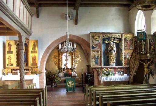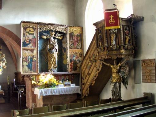 Die barocke Kanzel aus dem Jahre 1697 wird von einem Engel getragen. In ihren Feldern sind die vier Evangelisten und Christus als Weltenretter dargestellt. Daneben ist der Marienaltar zu sehen, er wurde 1470/80 kunstvoll geschnitzt und bemalt. Sein Meister ist wahrscheinlich Valentin Wolgemut.