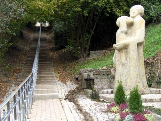 Genau 107 Stufen führen vom Ort zur Kirche hinauf. Gleich zu Beginn findet man die Veitsquelle und eine Skulptur die einen Wundarzt darstellt, welcher mit dem Quellwasser Augenleiden und Viehkrankheiten geheilt haben soll. Der "Veitsbrunnen" wie er auch genannt wird, gibt dem Ort seinen Namen.