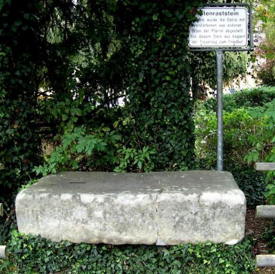 Am Dorfplatz steht ein "Totenraststein" hier wurde die Trage mit den Verstorbenen abgestellt bevor sie die vielen Steinstufen hinauf zum Friedhof getragen werden mussten.