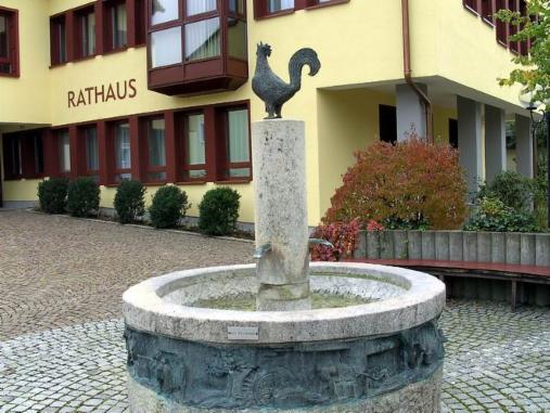 Der Brunnen vor dem Rathaus, mit einem Hahn, dem Wappentier des Ortes. Er wurde von einem einheimischen Künstler errichtet. Den Brunnentrog aus Sandstein ziert ein Reliefband aus Bronze mit Motiven der Veitsbronner Geschichte.